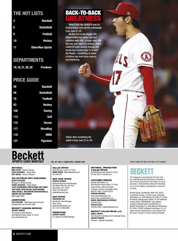 Beckett Sports Card Monthly is a monthly magazine loaded with everything you need to know about new all sports, non-sports, gaming cards and more. It offers news, values for new releases as well as past sets along with the latest collecting trends. Our readers use this magazine to find out what's new, what their cards are worth, who's hot, who's not and more. For veterans and novices, Beckett Sports Card Monthly is a must-have resource to stay informed and aware of the hobby. What to expect in each issue: • Editorial coverage: A mix of news, features and opinion pieces covering what’s new and what’s interesting in the hobby along with insight on how and what to collect. • Previews: All you need to know about upcoming card sets. • Reviews: Breakdowns and opinions of the newest card releases. • The Hot List: A visual list and values for the 20 hottest cards on the market. • The Price Guide: More than 200 pages filled with price ranges for new releases and past sets. • Market Watch: A look at the key players and products to collect.