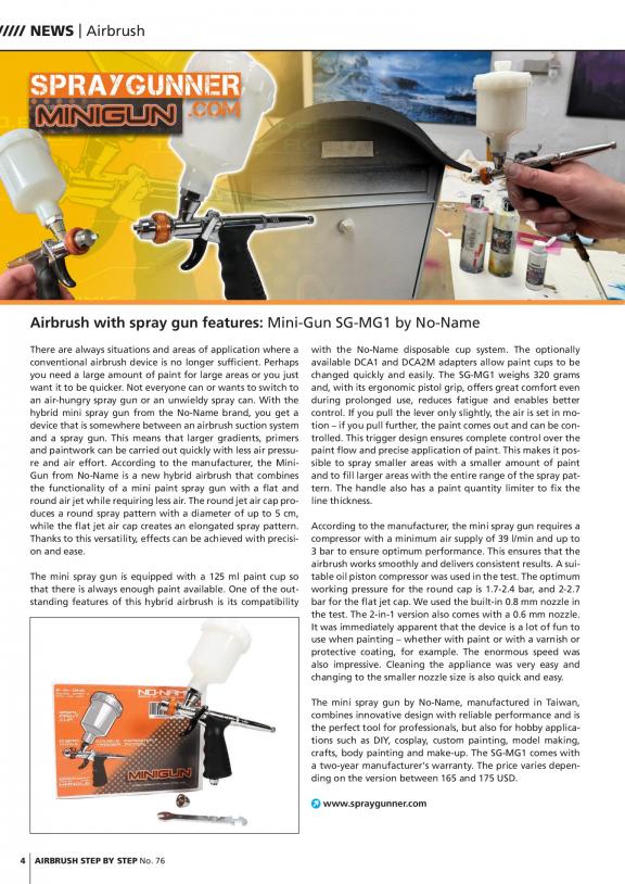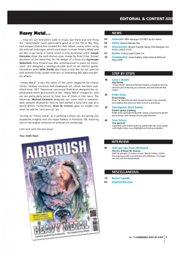 Airbrush Step by Step is the magazine for all airbrush artists - from the beginner to advanced level. It appeals to classical airbrusher and plastic scale modellers, to the body or custom painter as well as professional illustrators. Airbrush Step by Step aims at providing practical airbrush advice and helping readers to improve their skills through creative user tipps and basic information. With Airbrush Step by Step magazine readers bene t from detailed how to descriptions of all kinds of airbrush illustrations, custom painting, bodypainting and further airbrush use, for any skill level. Read about events and news from the airbrush scene, tips from experts as well as reports on airbrush jobs and projects. The magazine also provides basic information, making-ofs, artist interviews and portfolios and product reviews.