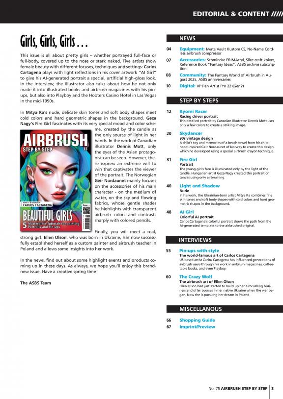Airbrush Step by Step is the magazine for all airbrush artists - from the beginner to advanced level. It appeals to classical airbrusher and plastic scale modellers, to the body or custom painter as well as professional illustrators. Airbrush Step by Step aims at providing practical airbrush advice and helping readers to improve their skills through creative user tipps and basic information. With Airbrush Step by Step magazine readers bene t from detailed how to descriptions of all kinds of airbrush illustrations, custom painting, bodypainting and further airbrush use, for any skill level. Read about events and news from the airbrush scene, tips from experts as well as reports on airbrush jobs and projects. The magazine also provides basic information, making-ofs, artist interviews and portfolios and product reviews.
