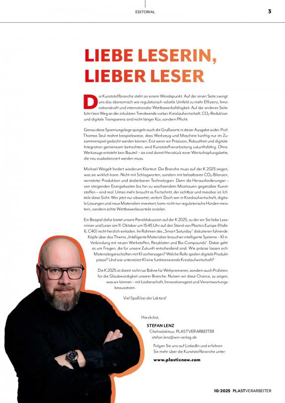 PLASTVERARBEITER: Das Entscheidermagazin für effizientes Produzieren und erhöhte Marktchancen in der Kunststoff verarbeitenden Industrie – Informationen aus der Praxis: fundiert recherchiert, leicht lesbar, schnell umsetzbar. Der PLASTVERARBEITER unterstützt Kunststoffverarbeiter in Zeiten steigenden Kostendrucks und zunehmender Globalisierung, kosten- und ressourceneffizient zu produzieren, sowie neue Marktchancen frühzeitig zu erkennen. Vorgestellt werden innovative Produkte und Fertigungsstrategien. Im Fokus stehen konkrete Problemstellungen aus der Praxis.