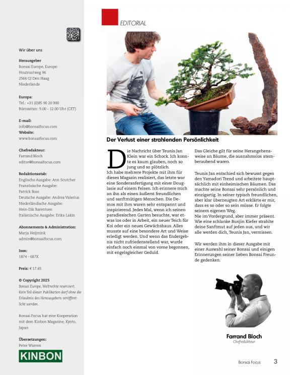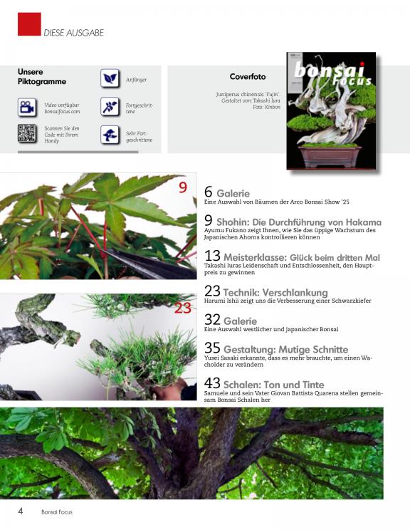 Entdecken Sie die fasinierenden Inhalte der Bonsai Focus! Mit vielen interessanten, informativen Reportagen und fantastischen Fotografien, erscheint das Magazin alle zwei Monate. Das Bonsai Focus Magazin zeigt Ihnen außergewöhnliche Bonsai, großartige Gestaltungen berühmter Meister, lehrreiche Techniken und brauchbare Pflege-Tips. Häufig gibt es zu den Artikeln exklusive und atemberaubende Videos.