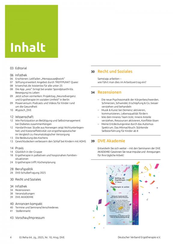 ERGOTHERAPIE UND REHBILITATION - Die führende Fachzeitschrift für Ergotherapie. Offizielles Organ des Deutschen Verbandes der Ergotherapeuten e.V. Die Fachzeitschrift zählt nicht nur bei den Mitgliedern des Deutschen Verbandes der Ergotherapeuten e.V. zur Pflichtlektüre. Darüber hinaus hat sie einen großen festen Abonnentenstamm, bestehend z.B. aus Kliniken, Praxen, medizinischen Schulungseinrichtungen und Rehabilitationszentren. Die Zeitschrift findet als fachwissenschaftliche Informationsquelle weithin Beachtung. Führende Praktiker und anerkannte Wissenschaftler schreiben in aktuellen und interessanten Beiträgen über die Ergebnisse ihrer therapeutischen Arbeit.