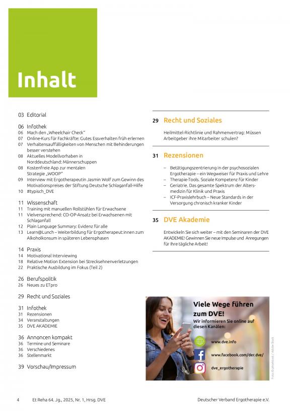 ERGOTHERAPIE UND REHBILITATION - Die führende Fachzeitschrift für Ergotherapie. Offizielles Organ des Deutschen Verbandes der Ergotherapeuten e.V. Die Fachzeitschrift zählt nicht nur bei den Mitgliedern des Deutschen Verbandes der Ergotherapeuten e.V. zur Pflichtlektüre. Darüber hinaus hat sie einen großen festen Abonnentenstamm, bestehend z.B. aus Kliniken, Praxen, medizinischen Schulungseinrichtungen und Rehabilitationszentren. Die Zeitschrift findet als fachwissenschaftliche Informationsquelle weithin Beachtung. Führende Praktiker und anerkannte Wissenschaftler schreiben in aktuellen und interessanten Beiträgen über die Ergebnisse ihrer therapeutischen Arbeit.
