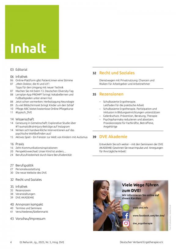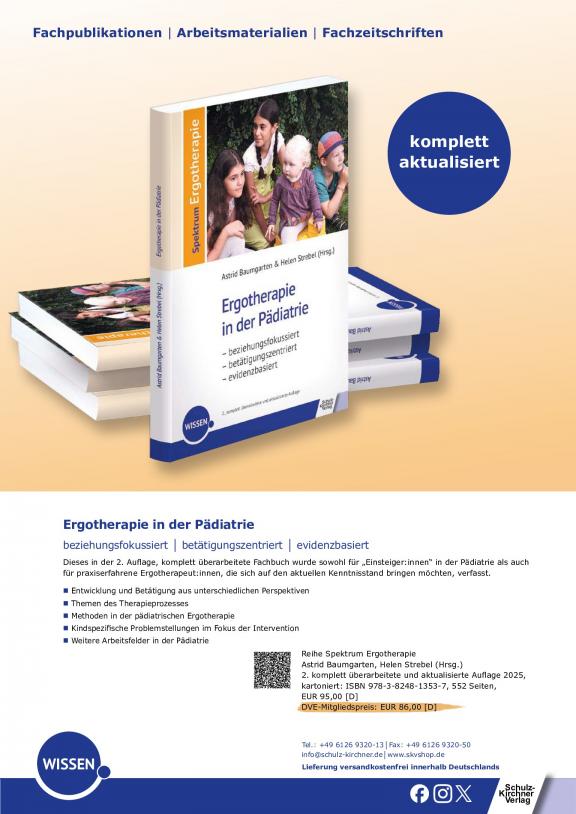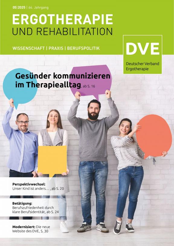ERGOTHERAPIE UND REHBILITATION - Die führende Fachzeitschrift für Ergotherapie. Offizielles Organ des Deutschen Verbandes der Ergotherapeuten e.V. Die Fachzeitschrift zählt nicht nur bei den Mitgliedern des Deutschen Verbandes der Ergotherapeuten e.V. zur Pflichtlektüre. Darüber hinaus hat sie einen großen festen Abonnentenstamm, bestehend z.B. aus Kliniken, Praxen, medizinischen Schulungseinrichtungen und Rehabilitationszentren. Die Zeitschrift findet als fachwissenschaftliche Informationsquelle weithin Beachtung. Führende Praktiker und anerkannte Wissenschaftler schreiben in aktuellen und interessanten Beiträgen über die Ergebnisse ihrer therapeutischen Arbeit.