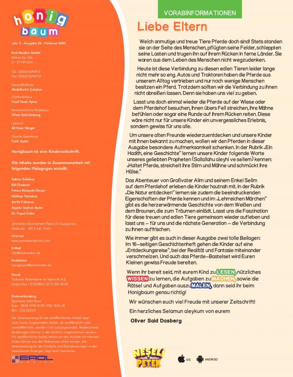 Liebe Eltern Wenn ihr bereit seid, mit eurem Kind zu LESEN, nützliches WISSEN zu lernen, die Aufgaben zu MACHEN, sowie die Rätsel und Aufgaben auszuMALEN,, dann seid ihr beim Honigbaum genau richtig! Wir wünschen euch viel Freude mit unserer Zeitschrift! Ein herzliches Selamun aleykum von eurem Oliver Said Dasberg