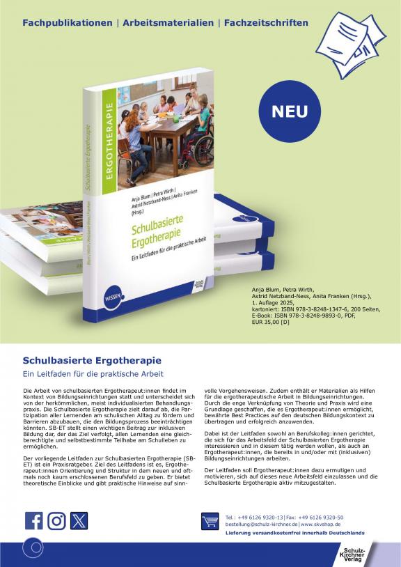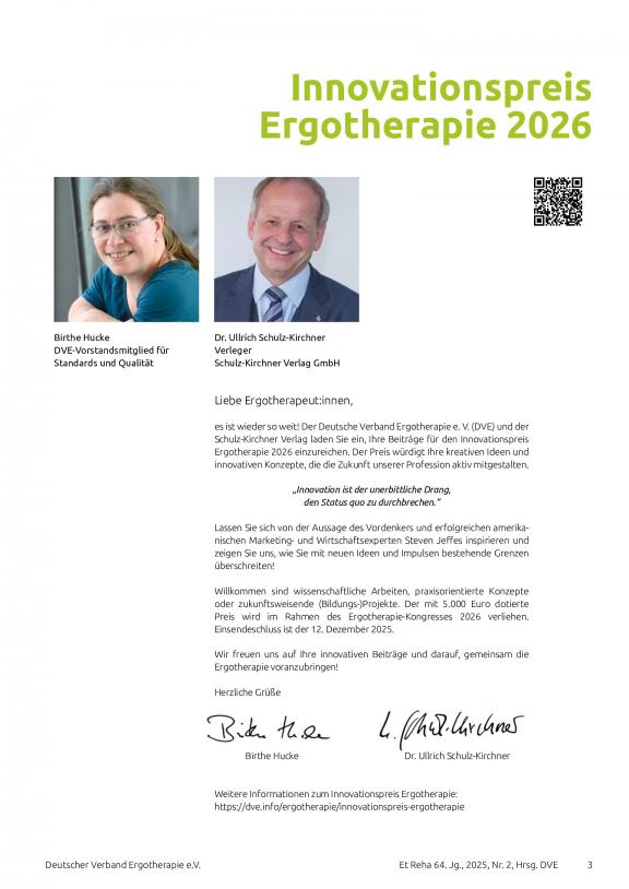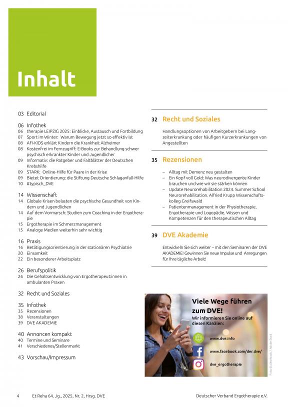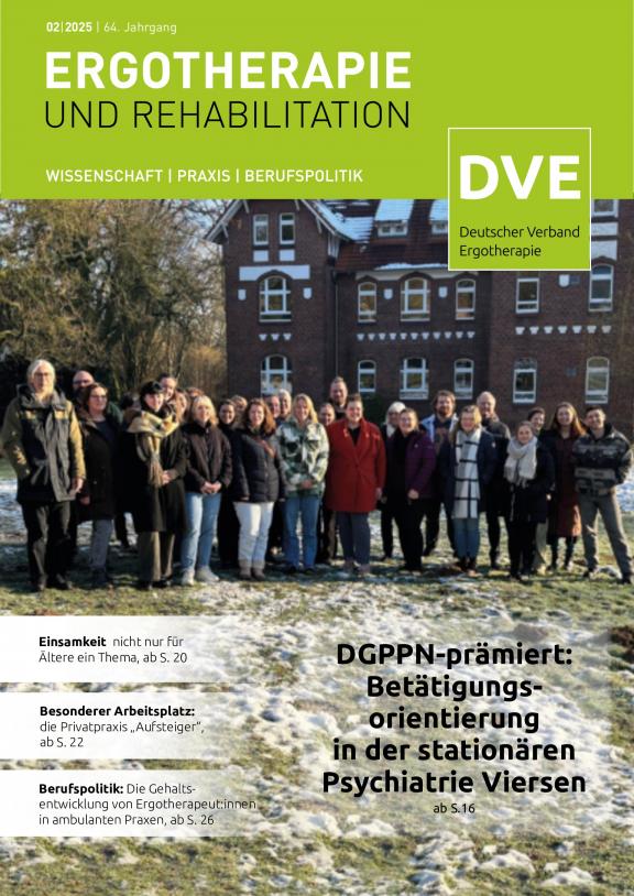 ERGOTHERAPIE UND REHBILITATION - Die führende Fachzeitschrift für Ergotherapie. Offizielles Organ des Deutschen Verbandes der Ergotherapeuten e.V. Die Fachzeitschrift zählt nicht nur bei den Mitgliedern des Deutschen Verbandes der Ergotherapeuten e.V. zur Pflichtlektüre. Darüber hinaus hat sie einen großen festen Abonnentenstamm, bestehend z.B. aus Kliniken, Praxen, medizinischen Schulungseinrichtungen und Rehabilitationszentren. Die Zeitschrift findet als fachwissenschaftliche Informationsquelle weithin Beachtung. Führende Praktiker und anerkannte Wissenschaftler schreiben in aktuellen und interessanten Beiträgen über die Ergebnisse ihrer therapeutischen Arbeit.