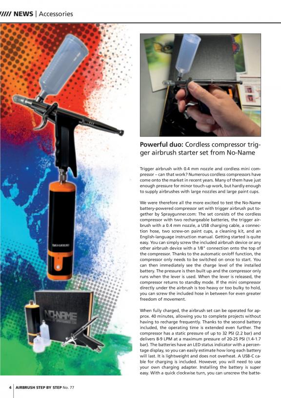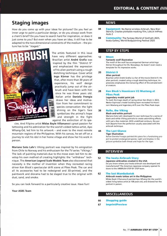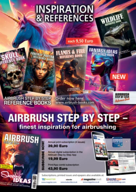 Airbrush Step by Step is the magazine for all airbrush artists - from the beginner to advanced level. It appeals to classical airbrusher and plastic scale modellers, to the body or custom painter as well as professional illustrators. Airbrush Step by Step aims at providing practical airbrush advice and helping readers to improve their skills through creative user tipps and basic information. With Airbrush Step by Step magazine readers bene t from detailed how to descriptions of all kinds of airbrush illustrations, custom painting, bodypainting and further airbrush use, for any skill level. Read about events and news from the airbrush scene, tips from experts as well as reports on airbrush jobs and projects. The magazine also provides basic information, making-ofs, artist interviews and portfolios and product reviews.