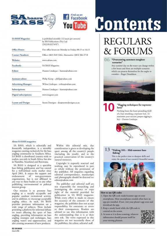 SA BASS, which is editorially and financially independent, is a monthly magazine catering exclusively for the bass angling community in Southern Africa. It is designed as a specialist bass fishing publication and has catered for a well-defined niche market since April 2001. It enjoys the support and endorsement of non-government organisations, but is not affiliated in any way to these bodies or to any other publishing, environmental or political interest group. SA Bass is a specialist publication, providing authoritative editorial exclusively on bass angling and related subjects such as boats, conservation and outdoor recreation vehicles. Articles are compiled by its own staff backed by a team of experienced bass anglers appointed as SA Bass Field Representatives throughout the country and overseas. Our mission is to promote bass angling as a socially acceptable and popular outdoor recreational activity, and in addition, to encourage acceptable angling ethics. As such, SA BASS provides pertinent information on a wide range of subjects. These include providing a platform for informed debate on issues affecting the sport of bass angling, providing information on bass angling strategies and techniques, bass angling waters and opportunities, and also creating awareness of new products. Within this editorial mix, due consideration is given to developing the sport among all the country's people (including the youth), and to the practical conservation of the country's natural resources. SA Bass is a key role player on behalf of bass anglers and the bass industry in negotiations with the Department of Environment Affairs and Tourism regarding regulations of the Biodiversity Act that regulate the presence of Bass in the country. SA Bass is the official organiser and presenter of a monthly bass angling tournament, known as the “Cast-for-Cash” Tournament Trail that provides an opportunity for recreational as well as experienced, top-level bass anglers to compete for prize money and trophies. To maintain and enhance the value of the publication, SA Bass presents its readers with regular reader competitions with prizes provided by many sponsors and advertisers. SA BASS is distributed country-wide to outlets, not only in South Africa, but also in Namibia, Swaziland and Botswana. Copyright is expressly reserved and nothing may be reproduced in part or whole without the permission of the publisher. Website: www.sabass.com.