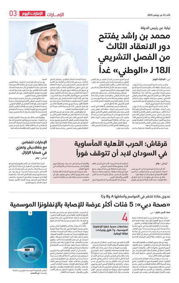 مكنك الآن الاستمتاع بتصفح النسخة الرقمية، والتي هي طبق الأصل عن النسخة الورقية لصحيفة الإمارات اليوم على هاتفكم الذكي أو الجهاز اللوحي أو على شاشة الحاسوب. النسخة الرقمية تتيح لكم تجربة متميزة للعدد اليومي بكل المقالات والأخبار والميزات وبطريقة سلسة حيث يمكنكم التمتع بقراءة صفحاتكم المفضلة مع إمكانية البحث ومشاركة الأخبار في أي وقت وأي مكان كمرادف عن النسخة الورقية. بالإضافة لميزة القراءة بدون إنترنت عند تحميل النسخة المطلوبة وميزات أخرى ستتعرفون عليها عند تحميل التطبيق.تركز صحيفة الإمارات اليوم التي صدر العدد الأول في 19/09/2005 في مجمل محتواها على الشأن المحلي، والقضايا التي تهم القراء العرب في دولة الإمارات العربية المتحدة، ضمن سياسة تلتزم بالشروط المهنية للعمل الصحافي.