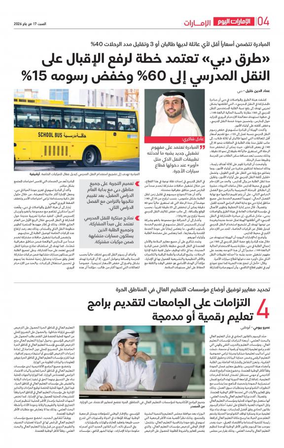 مكنك الآن الاستمتاع بتصفح النسخة الرقمية، والتي هي طبق الأصل عن النسخة الورقية لصحيفة الإمارات اليوم على هاتفكم الذكي أو الجهاز اللوحي أو على شاشة الحاسوب. النسخة الرقمية تتيح لكم تجربة متميزة للعدد اليومي بكل المقالات والأخبار والميزات وبطريقة سلسة حيث يمكنكم التمتع بقراءة صفحاتكم المفضلة مع إمكانية البحث ومشاركة الأخبار في أي وقت وأي مكان كمرادف عن النسخة الورقية. بالإضافة لميزة القراءة بدون إنترنت عند تحميل النسخة المطلوبة وميزات أخرى ستتعرفون عليها عند تحميل التطبيق.تركز صحيفة الإمارات اليوم التي صدر العدد الأول في 19/09/2005 في مجمل محتواها على الشأن المحلي، والقضايا التي تهم القراء العرب في دولة الإمارات العربية المتحدة، ضمن سياسة تلتزم بالشروط المهنية للعمل الصحافي.