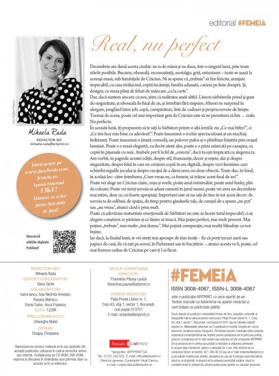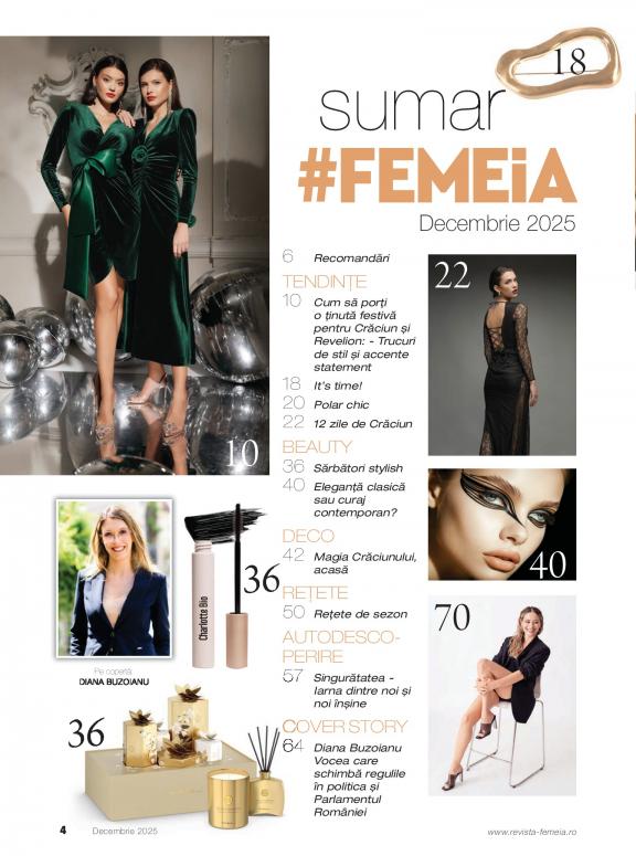 First issued in 1868, Femeia. is the first magazine for women in Romania. A powerful brand and a name that every woman knows, Femeia. is a social mark of femininity that constantly adapts to what being a modern woman means and an indispensable practical guide to living each day the best way possible. Encouraging active reading, involvement and communication, Femeia. serves as a strong voice that delivers simple, yet sound ideas about beauty, fashion, health, nutrition, family, culture and style.