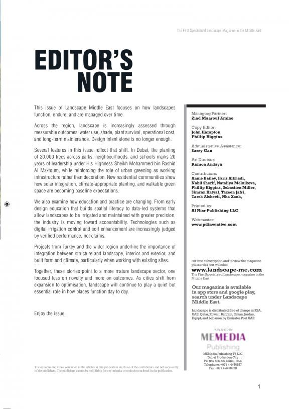 Landscape Magazine is the first specialized monthly publication targeting the landscaping industry in the Middle East.It is distributed to 5,500 professionals in the UAE, KSA, Bahrain, Kuwait, Oman, Qatar, Jordan, Egypt, and others.The list includes government agencies, developers, contractors, traders, consultants, landscape architects, and others in this field.